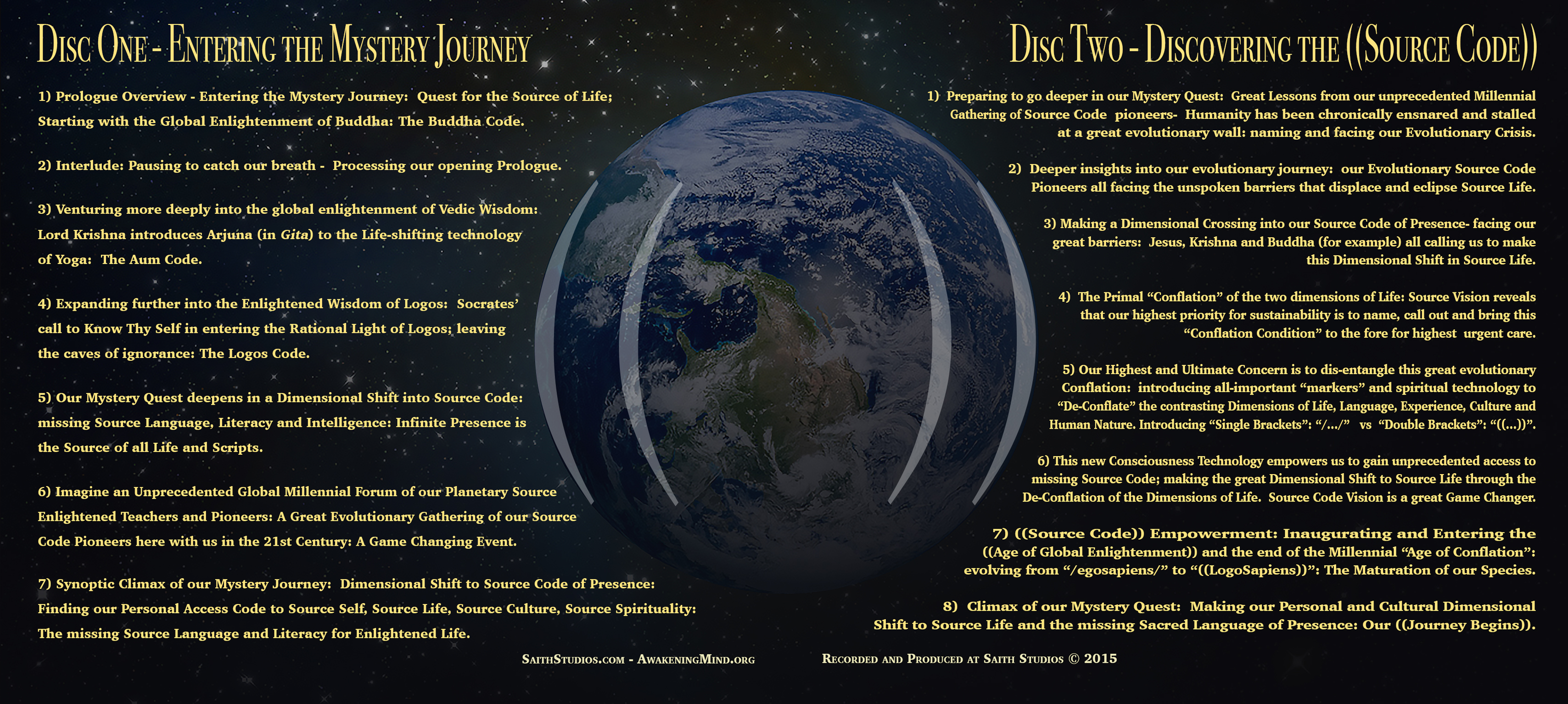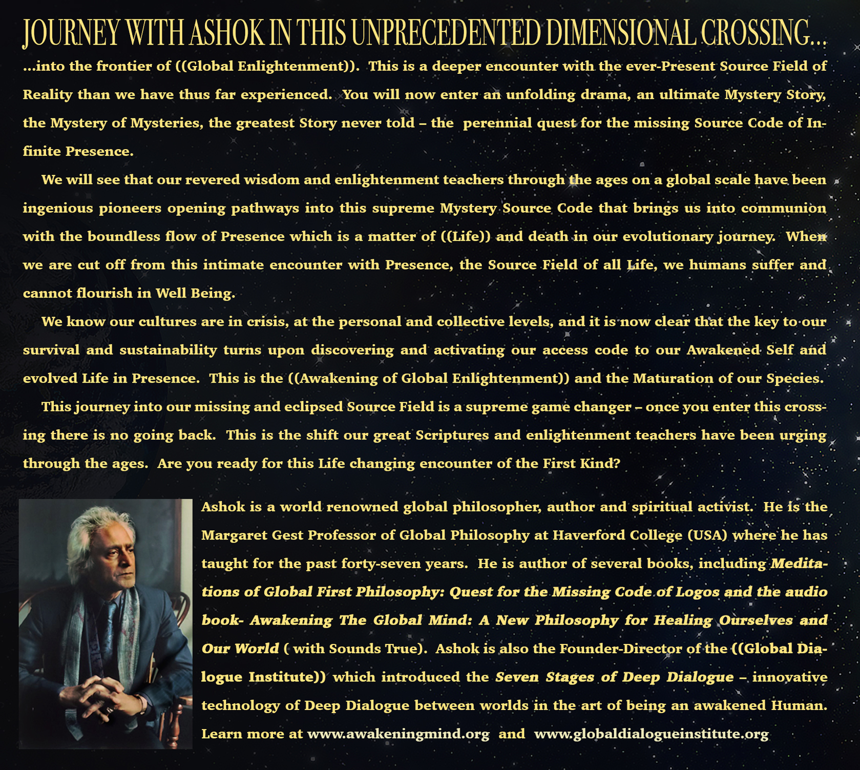 Journey with Ashok in this unprecedented dimensional crossing into the frontier of ((Global Enlightenment)). This is a deeper encounter with the ever-Present Source Field of Reality than we have thus far experienced. You will now enter an unfolding drama, an ultimate Mystery Story, the Mystery of Mysteries, the greatest ((Story)) never “told” – the perennial quest for the missing Source Code of Infinite Presence. We will see that our revered wisdom and enlightenment teachers through the ages on a global scale have been ingenious pioneers opening pathways into this supreme Mystery Source Code that brings us into communion with the boundless flow of Presence which is a matter of ((Life)) and death in our evolutionary journey. When we are cut off from this intimate encounter with Presence, the Source Field of all Life, we humans suffer and cannot flourish in Well Being. As we gain deeper access to this hitherto missing Source Code we make a long anticipated dimensional crossing into the Primal Space of Infinite Presence - the mysterious power of the Infinite Word opens, more powerful Source Vision dilates and we are empowered to SEE as never before profound missing Links as we EXPERIENCE the Continuum of Reality in boundless inter-connectivity. With this Source Vision we experience stunning revelations of the dormant consensus between and amongst our great scriptures and planetary wisdom and enlightenment teachings of the ages. In this dilated Source Vision it becomes clear that humanity has been stalled for millennia facing deeply entrenched self imposed barriers and have not yet tapped the potent Source Medicine of our great teachers and scriptures. It also becomes evident that our best current efforts at wisdom and enlightenment and spiritual activism are not truly addressing the evolutionary crisis as revealed through dilated Source Vision. Our current best efforts at “activism” are not bringing to the fore the depth of our millennial crisis and appear themselves to be symptoms of the crisis that threatens our sustainability. We know our cultures are in crisis, at the personal and collective levels, and it is now clear that the key to our survival and sustainability turns upon discovering and activating our access code to our Awakened Self and evolved Life in Presence. This is the ((Awakening of Global Enlightenment)) and the Maturation of our Species. This journey into our missing and eclipsed Source Field is a supreme game changer – once you enter this crossing there is no going back. This is the shift our great Scriptures and enlightenment teachers have been urging through the ages. Are you ready for this Life changing encounter of the First Kind?